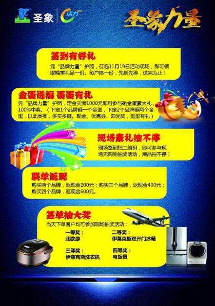 此次活动,圣象将推出“品牌力量”护照,消费者凭此签到可领取精美礼品,交订单满1000的还可参与100%中奖的砸金蛋,更有多个品牌联单返现活动。即使无购物也可参与现场抽奖,赢北欧游、伊莱克斯双开门冰箱等豪华大奖。