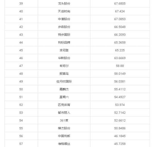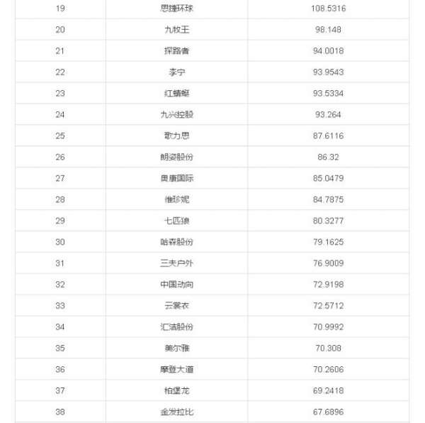 ,阿迪达斯和彪马的订单。 海澜之家、安踏、裕元集团和雅戈尔分别排第二至第五名,另外百丽国际、利丰、思捷环球等进入前20名,昨天在香港上市的江南布衣集团名列67名。