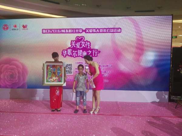 主办方还在当天的活动现场举行了爱心义拍仪式,拍卖作品是由海口翼彩艺术中心、海口胡画艺术中心选送的10幅儿童艺术作品。一幅来自海口胡画艺术中心学生程馨仪的作品《兔宝宝奇幻之旅》,表现的是小作者小时候每天睡觉前,妈妈讲的“兔妈妈和兔宝宝”的故事。兔宝宝慢慢长大了,独自一人冒险,探求未知的世界,开启她的人生奇幻之旅,表达了孩子对美好未来的好奇与憧憬!此次爱心拍卖的作品还有来自海口彩翼艺术中心的作品《跳舞的海豚》,该幅作品是孩子用画笔画出跳舞的海豚在大海中自由嬉戏,表达了对海豚的喜爱、对健康自由的祝愿。具活动主办方介绍,本次活动将把所有拍卖作品的拍卖款项累积捐助给需要帮助的贫困乳腺癌患者。