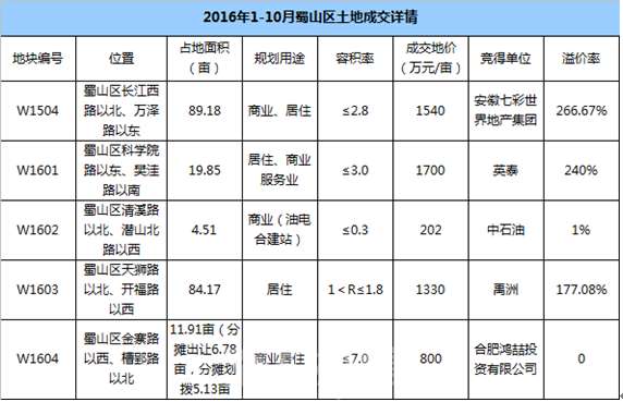 (2016年蜀山区地块成交详情 365淘房 张茹/制)