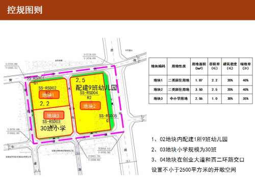 ??对于分割出来的两个小地块也规划了相关技术指标,其中紧邻蜀鑫路的56.14亩地块规划容积率为2.2,建筑密度最大为25%,绿地率最小40%,同时配建一所9班幼儿园,该幼儿园占地3800㎡,建筑面积约2822㎡。而紧邻西二环的51.53亩地块规划容积率为2.5,建筑密度、绿地率与上述地块一致,将预留2500㎡开敞空间。