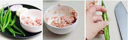 原料:杭椒、肉馅、洋葱、盐、生抽、糖、葱姜水、淀粉、芝麻油