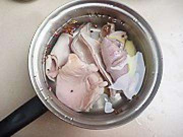 3.姜要大片,洋葱切大块,锅中加水,放入猪肚,倒放黄酒,焯一次水。