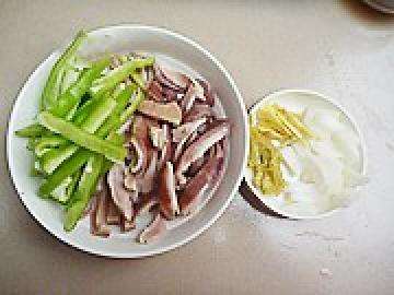 原料:猪肚、青椒、洋葱,姜做法:1.买回家的猪肚,先剪去多余的油块,分剪成大片,加面粉醋盐反复抓均匀,反复冲洗至到干干净净。