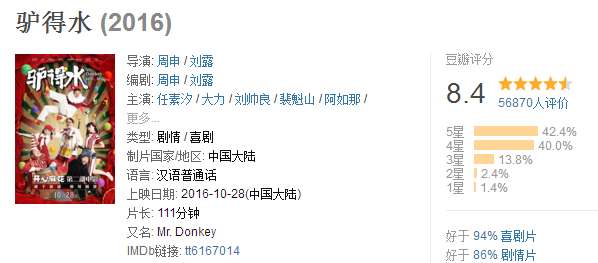 这么看来《驴得水》无法成为《夏洛特烦恼》之后第二个爆款作品,开心麻花也不失落?刘洪涛回应:“我们一直强调,(《驴得水》)过亿就是胜利,团队里之前还有人觉得,能有几千万元票房就不错了。”刘洪涛觉得,《驴得水》已经完成了团队预设的目标,“当时想的就是引起关注、要口碑,观众认可这是一部优质的黑色幽默电影。最近几年,像它这么犀利、针砭时弊的喜剧电影,国内电影市场是没有出现过的。”他举例说,上一次票房和口碑双丰收的黑色幽默喜剧,还是十年前的《疯狂的石头》,两相对比,同样是新导演处女作、无名气演员主演的《驴得水》,破亿之后还有上升空间的票房前景,怎么能说是失败呢?