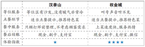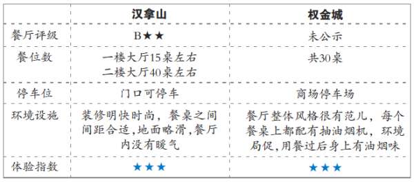 点评:两家韩式烤肉店的风格相似,品类也很相似,提供的餐品大同小异,在蘸料上,汉拿山是自助,权金城是配好的,本来汉拿山占有很大的优势,但是却被自己为了早下班的服务员放弃了“参赛权”。