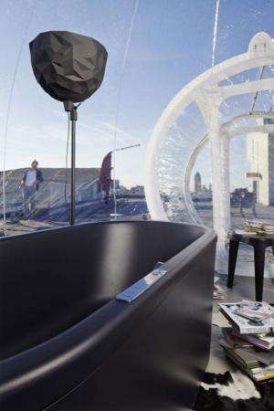 这是一个透明独立的茧状气泡,里面包含卫浴间中的基础设备。开放式的私密空间中,充满令人向往的惬意生活气息。