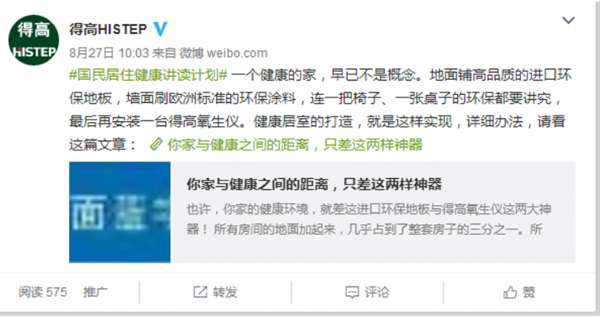 ),在装修旺季到来之前,启动了一项“国民居住健康讲读计划”,该项目发源于得高健康课堂,但在内容上更丰富,主张用地板改造环境,帮助国人全面解决选材难题,并且提供健康居住环境的全面知识。评价认为,这种举措,在当前泛家居行业尚属首次。