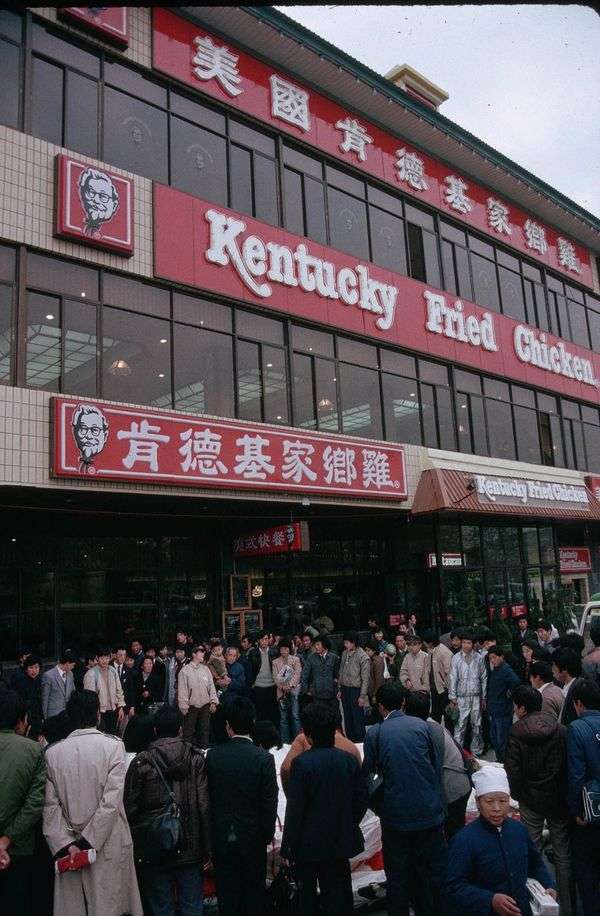 1987年,一群人在围观中国第一家肯德基炸鸡餐厅的开店仪式
