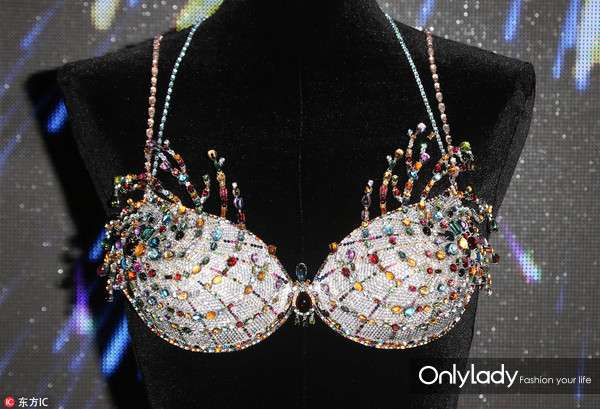 这件内衣价值200万美金,全名璀璨烟花梦幻文胸,耗时685小时,总重量375克拉,含18K金、126颗钻石,400余颗其他珍贵宝石。
