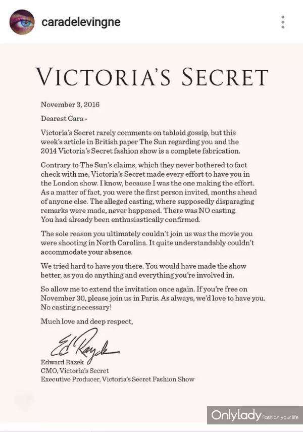 Cara Delevingne最近也在网络上晒出了维密大秀的邀请!邀请函中维秘的高层Ed Razek表示卡抽可以不!用!面!试!