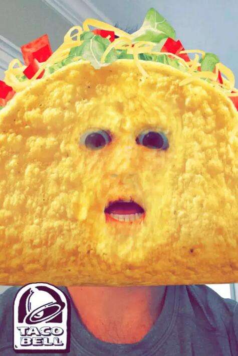 这也是为什么他们可以有足够的预判力和执行力,早在2013年5月就进驻日后爆红的图像制作分享软件Snapchat。Taco Bell 指派了两个二十多岁的年轻人,一周三次专职为其制作原创内容,从最开始的图片试水,到最后越玩越放松,短视频、表情包、电子贺卡、滤镜、实时在线游戏全上,毕竟这里没有字数和形式的限制,让他们和粉丝的交流更加深入。以传播最成功的 taco 滤镜为例,用户上传人像,它就会把头变成一只魔性的 taco ,就这个傻里傻气的东西,竟然录得了2亿多次的互动……