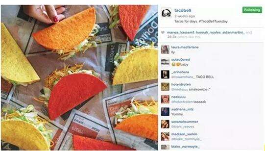 社交网络运营的关键,是品牌的拟人化。这个“人”不是一个宣传喇叭,而是另一个品牌的粉丝。所以 Taco Bell 在社交网络上的不少图片,画质也只能说是正常清晰,滤镜用的可能还不如粉丝多,有的直接在照片上印一行大字就发出来了(照片还可能是其他粉丝拍了直接借来用的)。