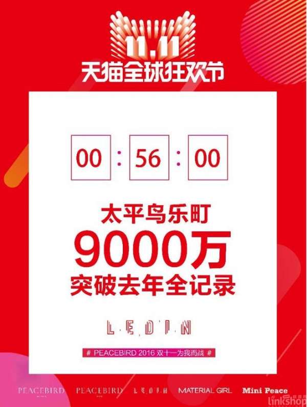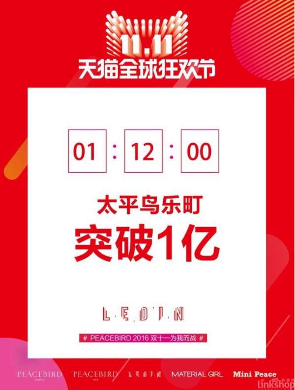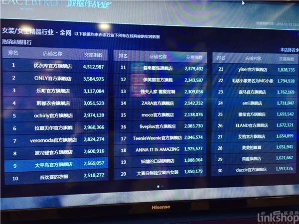 双11作战室的大屏幕上实时滚动着的数据显示,旗下品牌乐町已经突破1.3亿,在5个子品牌中排名第2。56分突破去年9000万全天记录,1小时12分,突破1亿。