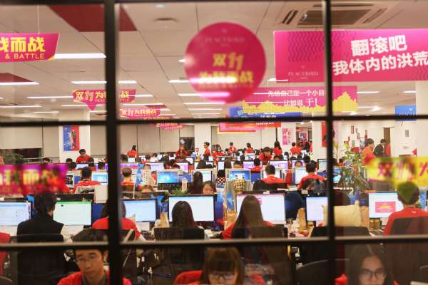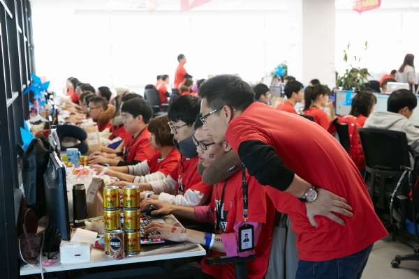 销售额是这场大战的考题。为了备战,这群人默默准备了一年。揭晓答案的这一天,现场灯火通明,他们穿着的红色T恤就似战袍,香槟和蛋糕就备在屏幕左边,紧张和兴奋赶走了在场所有人的疲惫。