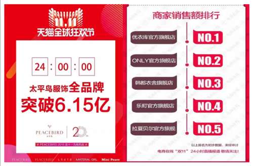 每年的双十一都是各路商家大显身手的日子,借着互联网的东风,商家们更是如虎添翼。2016年11月11日24点,太平鸟服饰以6.15亿的成绩精彩落幕,旗下品牌太平鸟女装和国民少女品牌乐町双双进入前列。据了解,此次双十一,乐町以1.65亿的销售额冲进天猫女装类TOP5,排名第四,并以1小时12分突破了一个亿的销售额,成为2016年双十一服饰类目的一匹黑马。