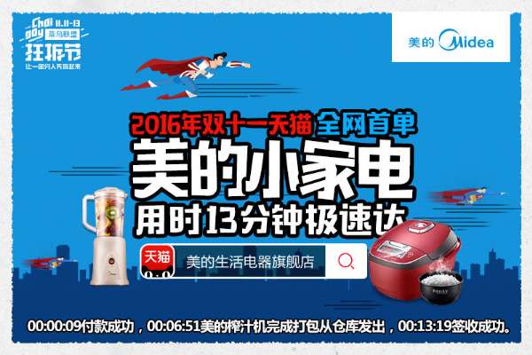 除了销量可观以外,美的小家电的物流也很快。双十一期间,美的生活电器事业部与“菜鸟联盟”达成战略合作,实现了货物全国统一部署,与菜鸟130多名优质合作伙伴公用分布在全国各地的庞大库容。在双十一当日0:13,美的小家电成为天猫双11狂欢全网配送第一单!全程只用13分钟就送达了美的榨汁机,今年双11购买美的生活电器的顾客忧虑全无,不必再担心快递一个星期才送到家的烦恼。