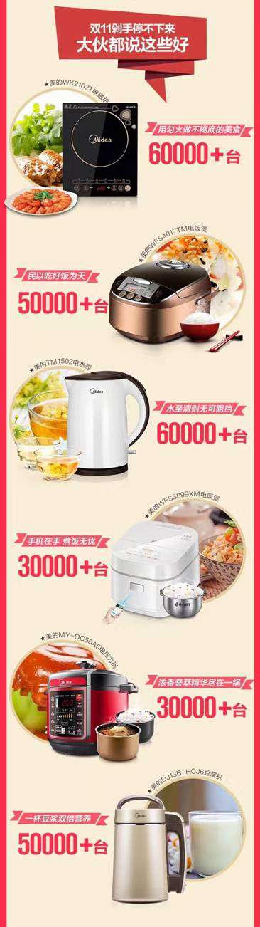 而在小家电的具体类目中,美的电饭煲、电压力锅、电磁炉、电热水壶等类目销量均获全网领先,表现不凡。