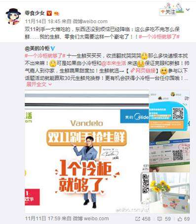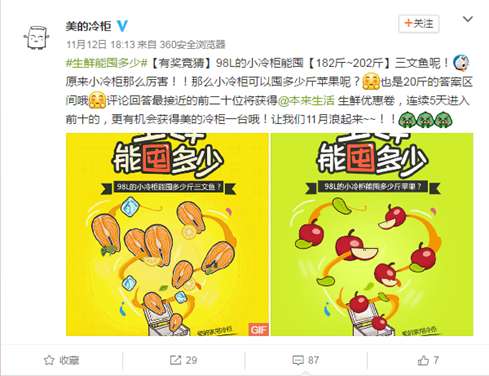 此外,美的冷柜还在微博上开展#生鲜能囤多少#互动竞猜的优惠活动,每天回答最接近答案的前20名用户可以获得生鲜优惠券。而且如果连续5天都进入前十名,就有机会获得美的冷柜一台!单纯竞猜不够给力,双十一不促不买说不过去。用户参与#你敢促 我敢买#活动话题,晒出购买美的冷柜或