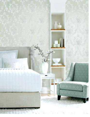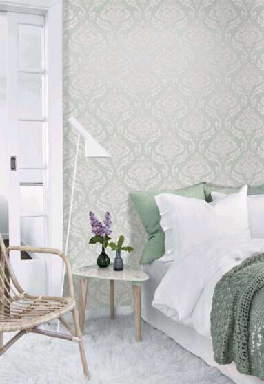 此款壁纸又是经典的大马士革造型,外部轮廓的细微调整使此款产品少了一些复古韵味,多了一些轻松与亲和。颜色是采用今夏家居最流行的清新之风,表面的水晶工艺给整个空间带来不一样的清爽与自然。此款壁纸既可以配复古家具打造典雅的欧式风情,又可以配以现代家具打造清新自然之风。