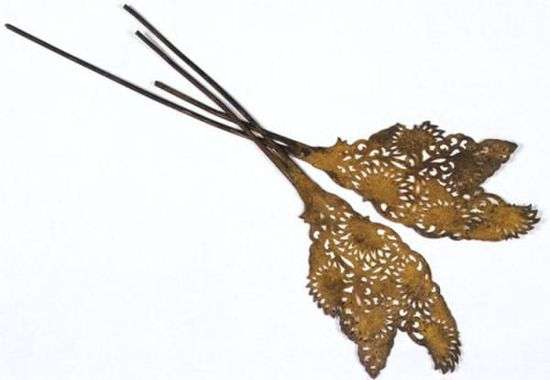 唐代开始流行使用金银打造首饰,剧照中,武如意所戴的是金钗雕花朵形,被称为钗朵。每一对钗朵都是一式两件,结构相同而图形相反,可以左右对称插戴,这种金银钗以镂花图案最为多见。