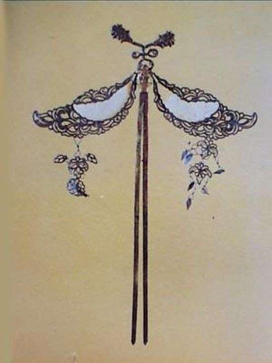 头饰:头饰也有了较前面明显的变化,采用金色头饰最多,还配以红色珊瑚头钗,鬓唇采用鎏金金钗垂到耳边,发髻上更是簪着两朵真花来点缀,还有金簪步摇、翠翘、珠翠金银宝钿、搔头等等。