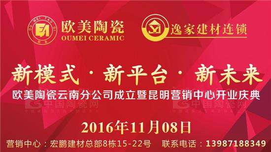 为了进一步开拓云南当地的市场,欧美陶瓷云南分公司选择与云南地区建材领跑者“逸家建材”达成合作关系,双方通力合作的“新模式 新平台 新未来”主题招商会暨昆明营销中心开业仪式将于2016年11月8日正式召开。
