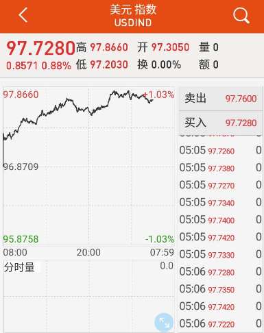 周一美元指数创4周新高,上涨0.88%%,现报97.728.