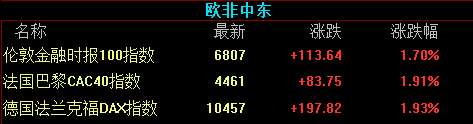各国股市方面,英国富时100指数上涨1.7%,报收于6806.90点,该指数受到了汇丰控股所带来的提振作用。德国DAX 30指数收盘上涨1.93%,报10456.95点。法国CAC 40指数收盘上涨1.91%,报4461.21点。