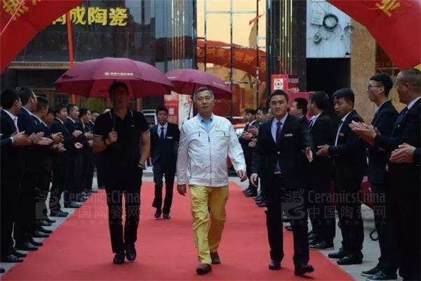 广东欧雅企业董事长霍炳祥先生在逸家建材欧美陶瓷运营事业部魏顺勇总经理的引领下进入开业庆典会场