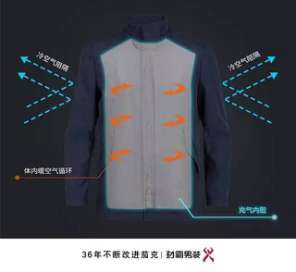 茄克躯干部位设计有可充气内胆。平时,它是一件轻薄有型的茄克。一旦气温降低,你就可以打开隐蔽充气阀――只需三口气、十秒钟,就能将它变成一件防风保暖的御寒服!