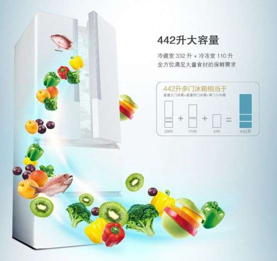 冰箱内部整体的442升、冷藏室332升、冷冻室110升的超大容量设计,可全方位满足您采购大量食材的保鲜需求。而在能耗方面,该机属于国家一级能耗产品,日耗电量仅为每天0.94千瓦时,非常节能环保。