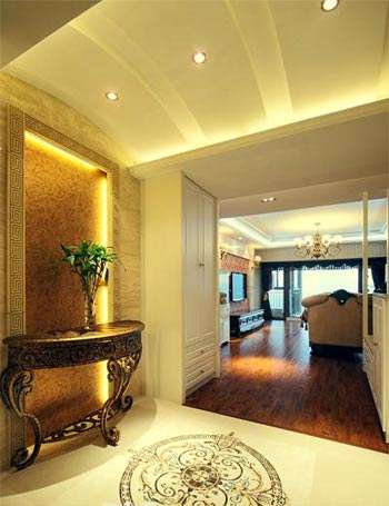 玄关富贵盈门,这里原是内窗,经过改装设计成玄关,正面采用金花米黄云石加砂岩造型走边,墙面用金色墙纸,地面选了成品地砖拼花,顶部做了拱形处理,彰显贵气。