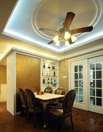 :客厅入餐厅开口太小,采用吊扇灯,既能调节空调效果,同时契合设计风格。酒柜的背面就是入户的玄关,旁边原来结构是混凝土墙,无法改动,就势做了个多功能柜,旁边空间做成酒柜,最大程度利用空间。