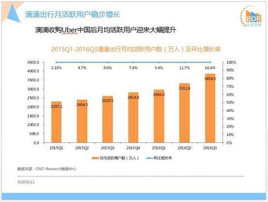 而在对用户的吸引力上,报告数据显示,2015年以来,滴滴专车月活跃用户稳步增长。在8月滴滴在收购Uber中国后,月均活跃用户数迎来大幅提升,今年三季度,滴滴专车月均活跃用户数增至3854.4万人,环比增长16.4%,这一增幅较二季度时还扩大4.7个百分点。