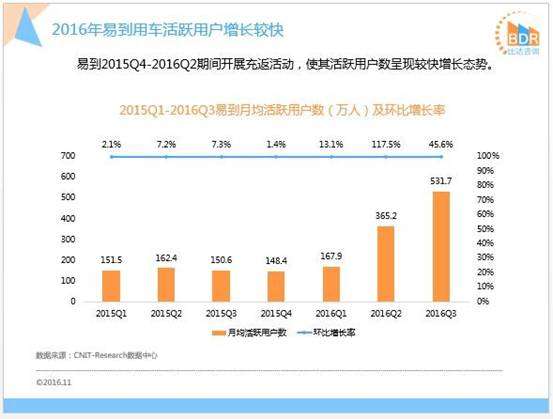 易到用车的月活数据也保持了同样的增长态势。报告指出,2016年易到用车活跃用户整体增长较快,今年三季度易到用车月均活跃用户数达531.7万人,环比增幅高达45.6%。对此,报告解释称,易到在2015年Q4至2016年Q3开展了充返活动,活跃用户数增长明显。