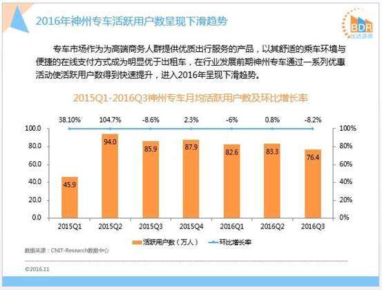 与市场份额走势类似,神州专车的活跃用户数在2016年也出现了下滑。报告数据显示,在行业发展前期,神州专车通过一系列优惠活动使活跃用户数得到快速提升,但进入2016年神州活跃用户规模不增反减,今年三季度,神州专车月均活跃用户数仅为76.4万,较二季度时还降低了8.2个百分点。