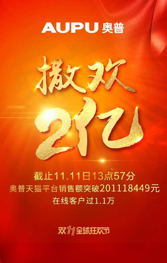 11月11日13:57分,奥普官方旗舰店、奥普集成吊顶店销售额突破2亿,达到201118449元!