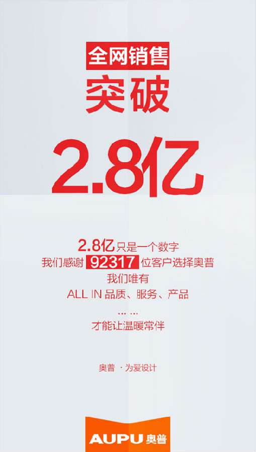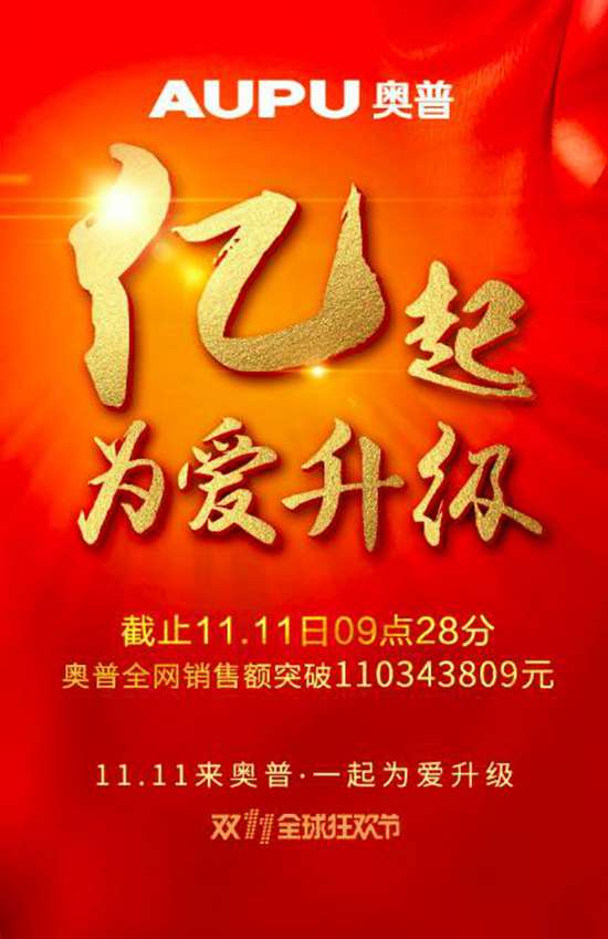 2016年天猫双 11 购物狂欢节已经落下帷幕,中国浴霸行业创始品牌、中国集成吊顶行业领导品牌AUPU奥普以全网销售额高达2.8亿的销售成绩,成交用户数高达92317人,售出吊顶30000户,售出浴霸80000台,温暖范围再次扩大44万平方米,这一切的成就都归功于消费者对奥普24年温暖品牌、金牌品质、无忧服务的认可。