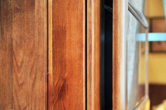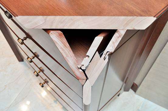 图为左侧柜门推开后重叠于右侧柜门前方,推拉非常顺畅。柜门厚度采用了25mm板材,圆弧形的设计磨去了棱角,使原本笨拙的形象变得憨厚可掬,非常考验工艺。