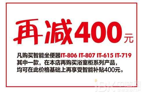 活动期间,购欧路莎智能马桶IT-806JD、IT-807JD、IT-615、IT-719其中的任意一款,且在同一家专卖店联单购浴室柜系列产品,即可在此价格基础上立享智能补贴优惠400元,一站式购齐更省钱、省心!