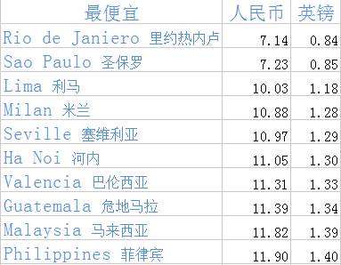 的里约热内卢和圣保罗,人们不需要花费多少钱,就可以享受一杯浓香四溢的咖啡,当地一杯普通的咖啡(即不算名牌的咖啡)只需要人民币7.2元(以下货币单位均为人民币)。而在伦敦,一杯咖啡平均售价在15.5元,显然要贵很多。