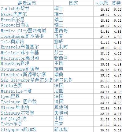 这两个中国城市也纳入了调查范围。香港一杯星巴克咖啡的价格为35.53元(4.18英镑),排名全球第8位;北京的价格为32元(3.74英镑),排名全球第13位(注,价格相同的城市并列,比如并列第一的是4座瑞士城市)。
