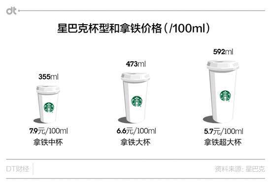 这么多顾客被怂恿升杯,因为……确实大杯更划算啊!DT君给大家算了算三个杯型的拿铁在中国每100毫升的“单价”: