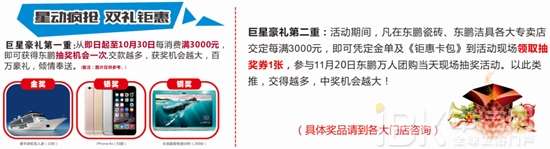 二重礼:活动期间,凡在东鹏瓷砖、东鹏洁具各大专卖店交定每满3000元,即可凭定金单及《钜惠卡包》到活动现场领取抽奖券1张,参与11月20日东鹏万人团购当天现场抽奖活动。以此类推,交得越多,中奖机会越大!