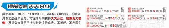 活动期间(即日起―11月19日),客户在东鹏瓷砖、东鹏洁具专卖店提早交定,可在活动前获得天天分红,钜惠史无前例,所得分红可用于抵扣货款(限单店、不折现、不找零)