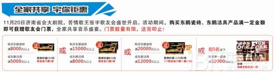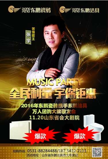 11月20日济南省会大剧院,苦情歌王张宇歌友会盛世开启。活动期间,购买东鹏瓷砖、东鹏洁具产品满一定金额即可获赠歌友会门票,全家共享音乐盛宴。门票数量有限,送完即止!
