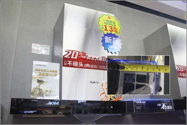 厨房柜台台面宽度一般为550-600mm,目前烟机侧面宽度为520mm,帅康通过人机工程学的分析测试后,将油烟机机身整体升级变薄了70mm,使得烹饪的过程中视野及操作范围更加宽广,不用担心碰头的问题。