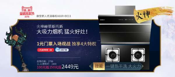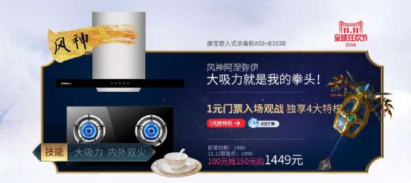 10月10日,康宝电器在天猫康宝旗舰店(https://canbo.tmall.com)置换首页,以“雅典娜的预言”为主标题,“双11决战 抢先预售”为副标题,为我们铺展出一则蓬勃大气的传说画卷。