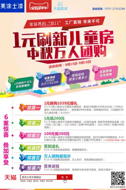 看完攻略,连小编都觉得真是太给力了!但是,还没完!最强优惠还在后面——美涂士漆1元刷新儿童房!